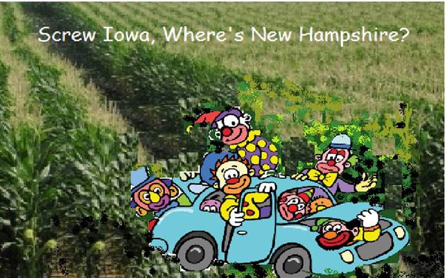 * Santorum has gleefully gotten the erroneous message that he can win and will lunge forward with renewed vigor to be beaten by Huntsman (0.6 share in Iowa) in New Hampshire and end up on the bottom (again). He will then go on to South Carolina and end up 4th or 5th and will then issue forth the “it’s been a great day for conservatives” speech and tearfully drop out.